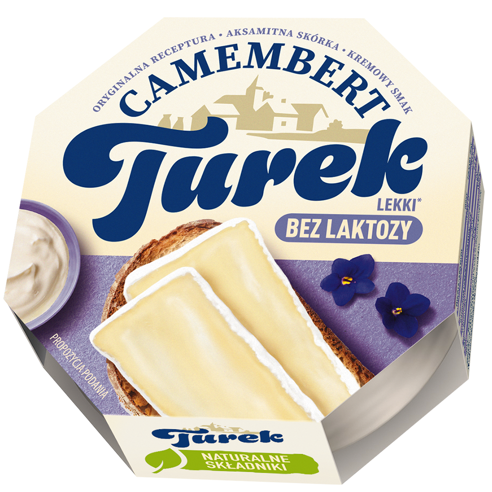 Turek Camembert lekki bez laktozy ma mniejszą zawartość tłuszczu względem Turek Camembert naturalny oraz większą zawartość białka. Świetnie sprawdzi się także jako dodatek do sałatek lub jako przekąska na deskę serów.