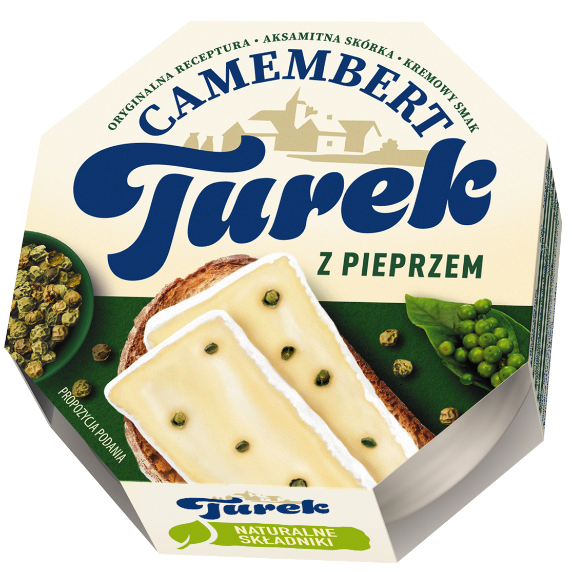 Turek Camembert jest tworzony ze starannością i dbałością przez doświadczonych serowarów, a jego prosty skład jest naturalny. Turek Camembert z zielonym pieprzem to idealny na kanapki, delikatny, rozpływający się w ustach ser z białą, aksamitną skórką z porostem białej pleśni. Aromatyczne ziarna pieprzu wspaniale przełamują łagodny smak camemberta. Świetnie sprawdzi się także jako dodatek do sałatek lub jako przekąska, na deskę serów.